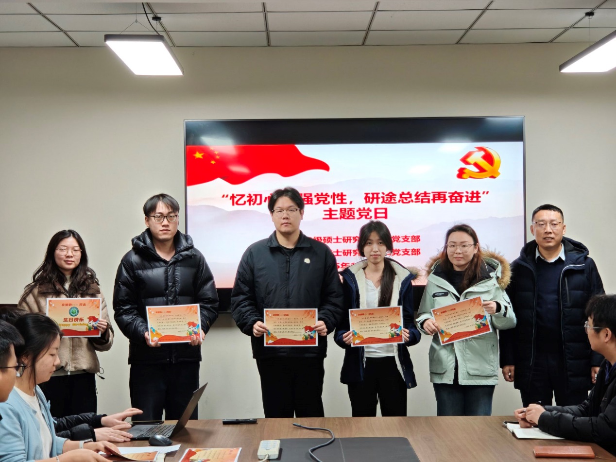 王凯充分肯定了2023级研究生党员在2025年度取得的成绩。他强调,重温入党誓词、为党员过“政治生日”,是基层党组织开展党内政治生活的重要方式。希望全体党员常思“当初入党为什么、如今在党做什么、今后为党留什么”,在实际工作生活中时刻以党员标准严格要求自己,自觉增强党性锻炼,充分发挥先锋模范作用。一要持续强化理论武装,特别是强化对党的二十届四中全会精神的学习,深入挖掘学科交叉点和新兴产业链,将其纳入个人未来发展规划中。二要做好个人学业规划和学术成果产出,把握好学位申请时间、流程和节点,制定、细化重点任务推进计划,统筹好学业进展与求职创业。三要积极关注人才供需动态和校内外招聘信息,主动拓展就业渠道和争取面试机会,将“小我”融入“大我”,到基层、西部、祖国需要的地方去建功立业。四要学会压力疏导与心理调适,加强与导师、辅导员、同学的沟通交流,主动关心关注自身和同学,共同筑牢校园安全稳定的屏障。