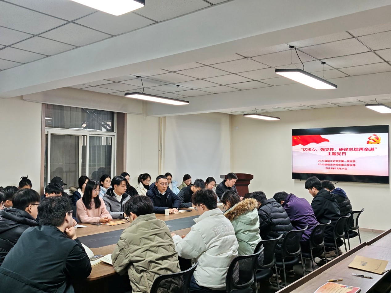 12月24日下午,2023级硕士研究生第一、第二党支部联合在雁塔校区北院学科楼205会议室开展“忆初心、强党性,研途总结再奋进”主题党日。副院长王凯参加活动。会议由2023级硕士研究生第一党支部书记同超主持。