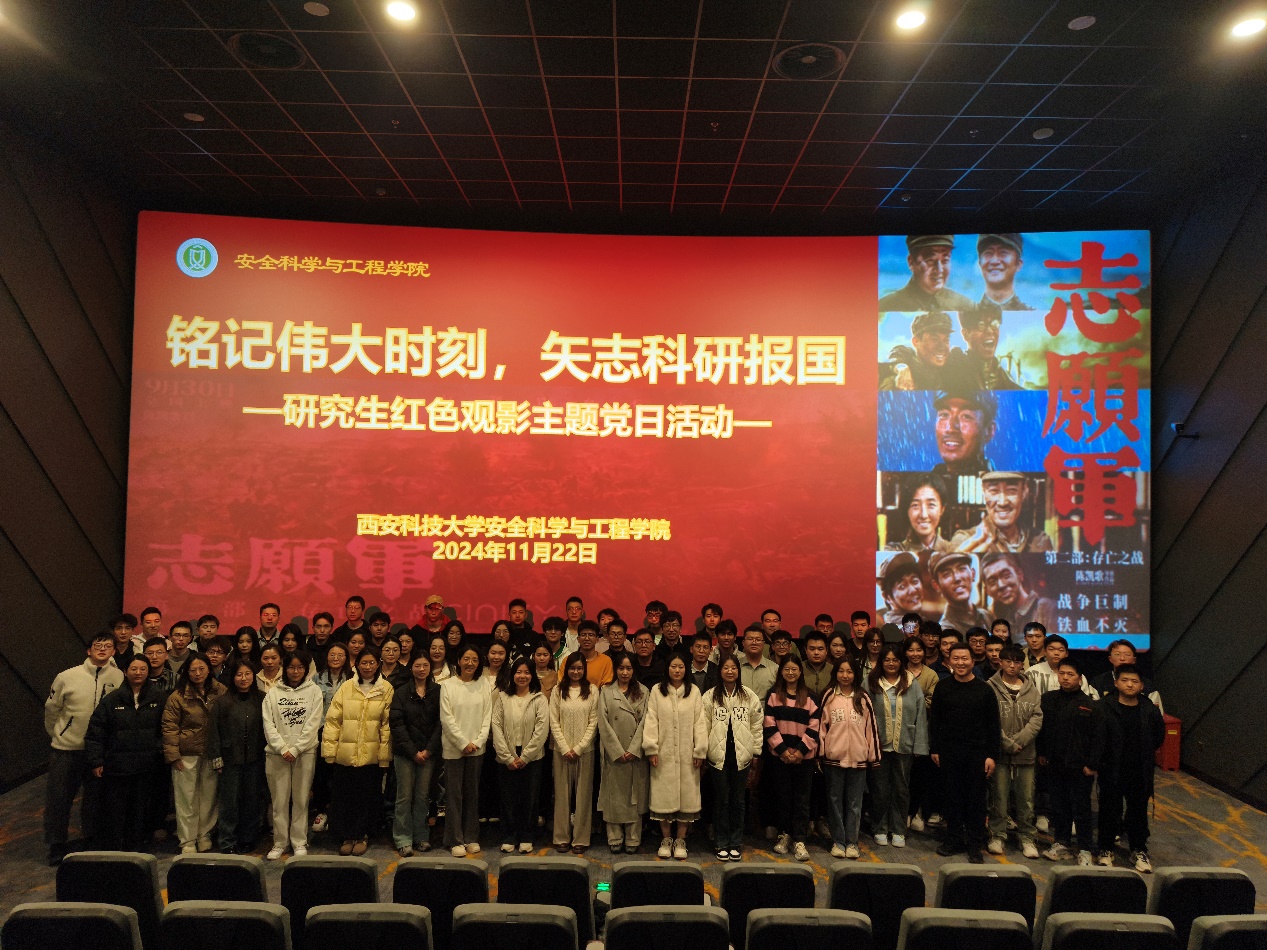 为深入学习贯彻党的二十届三中全会精神,进一步激发研究生党员的爱国情怀和科研热情,11月22日下午,安全学院组织开展“铭记伟大时刻 矢志科研报国”主题党日活动。在研究生辅导员同超老师的带领下,100余名研究生党员观看爱国主义教育影片《志愿军:存亡之战》,重温英雄壮举,领略英雄风采,致敬英雄模范。