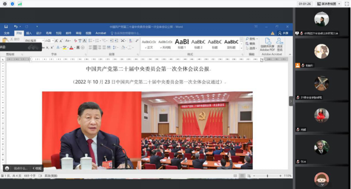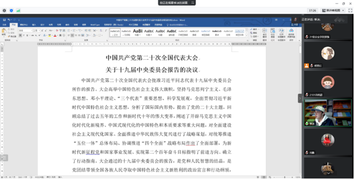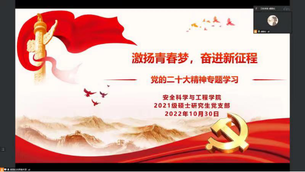 2022年10月30日下午,安全学院 2021级硕士研究生党支部在线召开以“激扬青春梦 奋进新征程”为主题的党员大会,专题学习党的二十大精神。会议由党支部书记胡丽红主持。分管研究生工作的副院长肖鹏应邀参加会议。