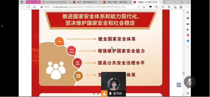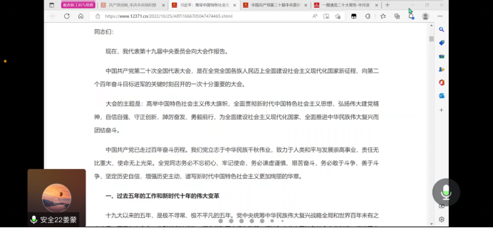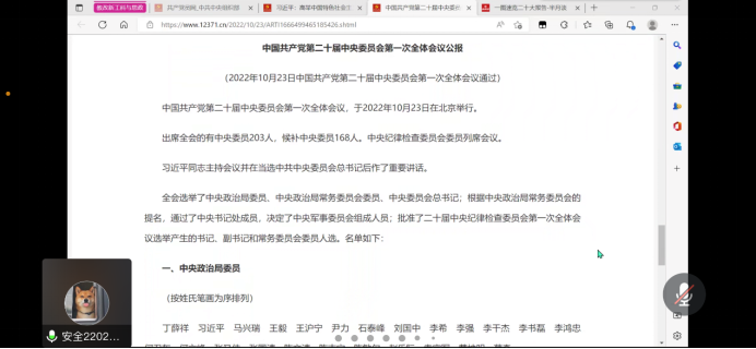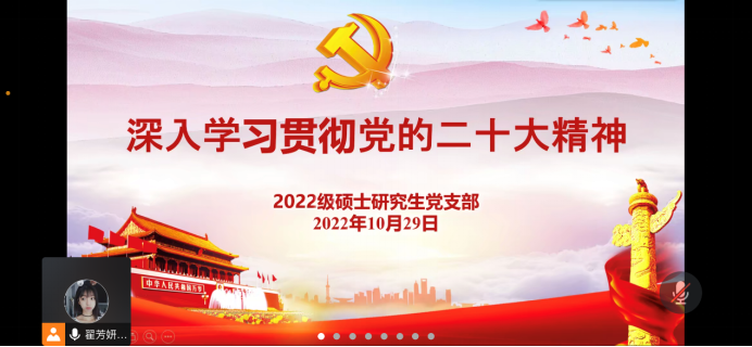 10月29日晚,安全学院2022级硕士研究生党支部通过腾讯会议,组织全体党员学习党的二十大精神。会议由支部书记翟芳妍主持。