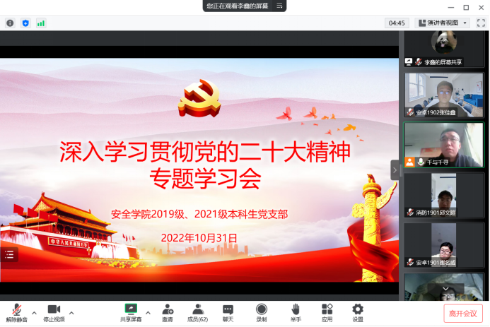 10月31日下午,安全学院2019级、2021级本科生党支部通过腾讯会议线上召开党员大会,专题学习党的二十大精神会。会议由党支部书记袁刚主持。学院党委书记刘文刚应邀参加会议。支部成员学院团委书记周学刚、2021级学生辅导员段思颖和全体学生党员参加了会议。