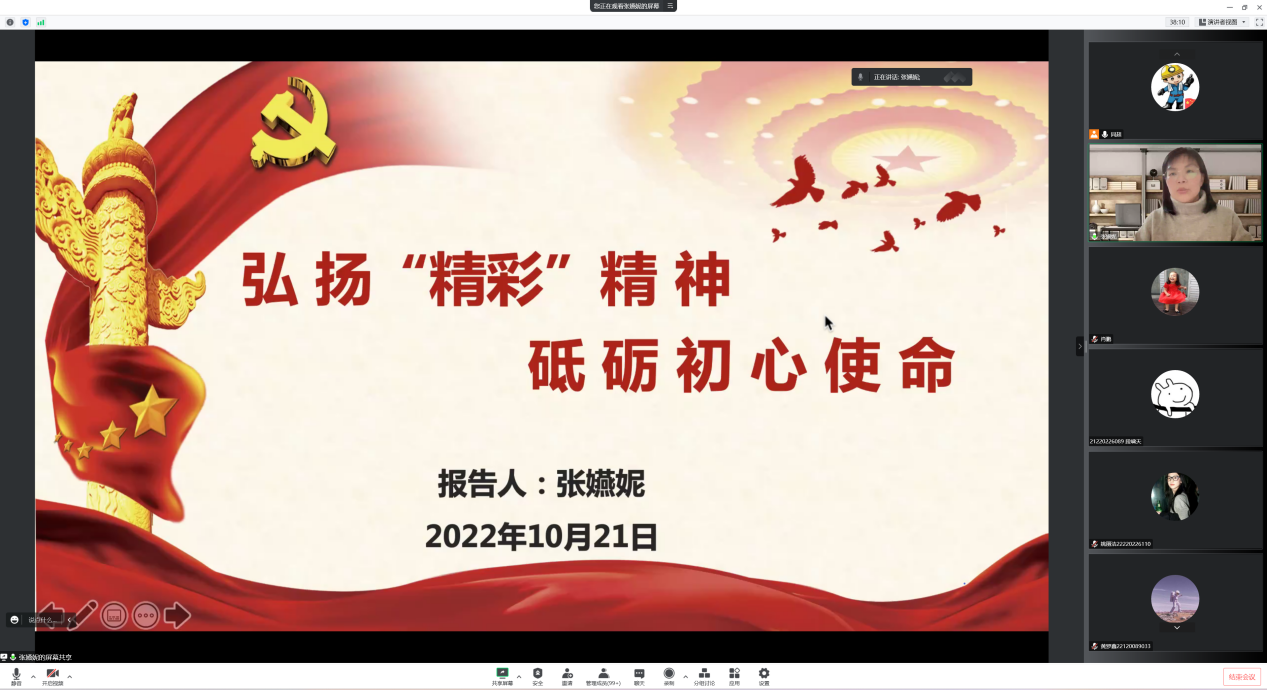 为进一步做好研究生校史校情教育,增进学生对学科专业的认知,丰富疫情影响下研究生科研、学习和生活内容,10月22日晚,安全学院通过腾讯会议线上举办研究生专题学术报告会,学院消防工程系主任、博士研究生导师张嬿妮教授应邀作《弘扬“精彩”精神,砥砺初心使命》主题报告,学院博、硕士研究生共计300余人聆听了报告,报告会由学院副院长肖鹏教授主持。