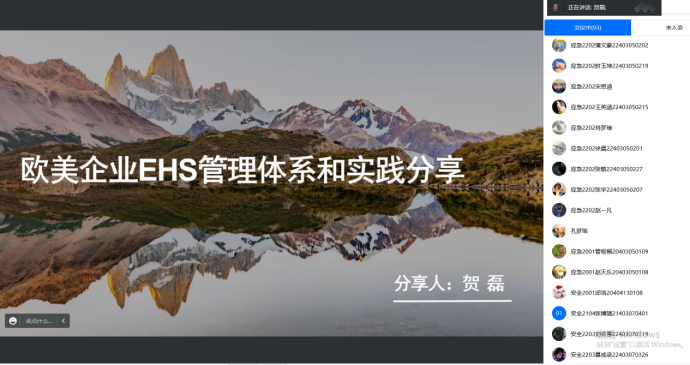 2022年11月26日晚,安全学院安全工程系依托西部安全工程虚拟教研室,与学校安全协会联合举办“安全工程学术沙龙”第三期讲座。本次沙龙由安全工程系主任王莉主持。美光科技-美光半导体(西安)有限公司EHS高级工程师贺磊受邀就欧美企业EHS管理体系和实践,对安全学院学生进行在线辅导。学院120余名本科生参与了本次沙龙。