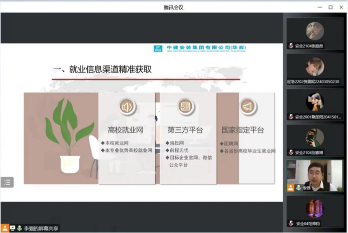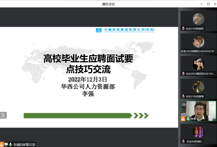 2022年12月3日晚,安全学院安全工程系依托西部安全工程虚拟教研室,与学校安全协会联合举办“安全工程学术沙龙”第四期讲座。本次沙龙由安全工程系副主任赵鹏翔主持。中建安装华西公司人力资源部副部长李强受邀就高校毕业生应聘面试要点技巧交流对安全学院学生进行在线指导介绍。学院100余名本科生参加了本次沙龙。