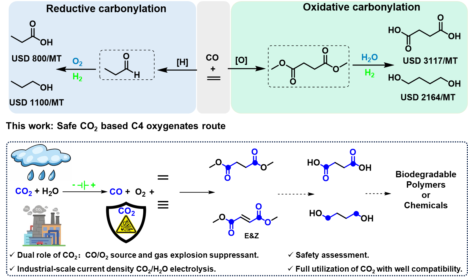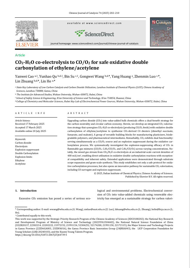 近日,安全科学与工程学院罗振敏教授团队联合中国科学院兰州化学物理研究所、武汉大学在化学领域顶级期刊《Chinese Journal of Catalysis》(中国科学院一区TOP期刊,影响因子17.7)上发表合作研究论文《CO2-H2O co-electrolysis to CO/O2 for safe oxidative double carbonylation of ethylene/acetylene》。该研究创新性地将CO2还原与羰基化反应耦合,为CO2的高值化利用提供了兼具高效与本质安全的新策略。该工作体现了安全科学与工程学科、化学工程学科的深度交叉融合。苏彬副教授为共同第一作者,罗振敏教授为论文共同通讯作者。
