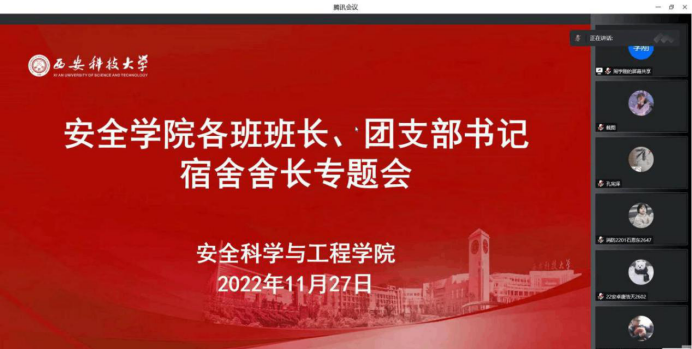 11月27日晚,安全学院线上召开本科生各班班长、团支部书记和宿舍舍长会议。学院党委书记刘文刚主持会议并讲话。学工办主任周学刚,辅导员王倩、曹月、袁刚、段思颖,以及各班班长、团支部书记和宿舍舍长,约240余人参加了会议。