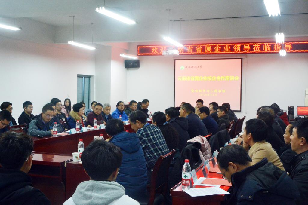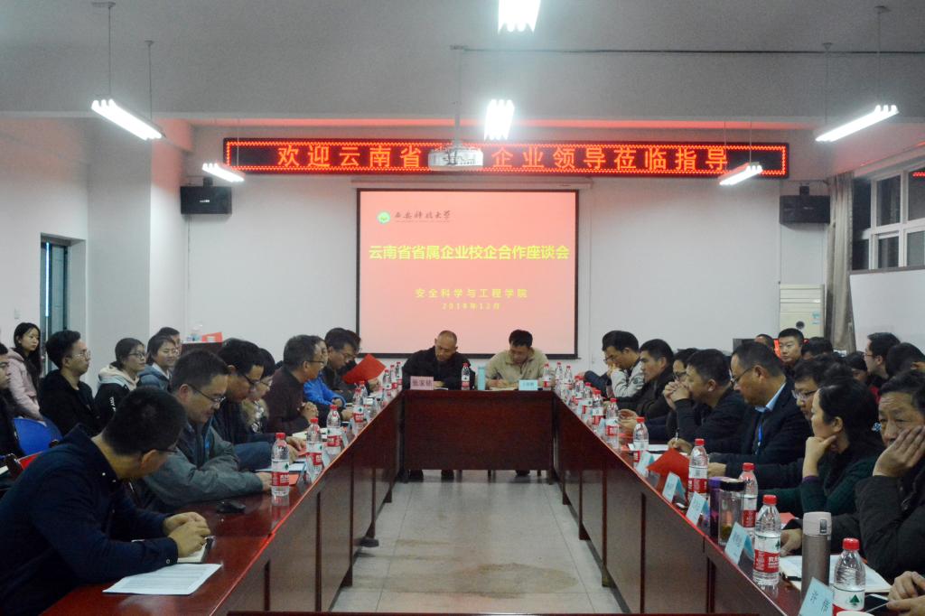 2018年12月5日晚,安全学院在14教323室与云南省省属企业举行了校企合作座谈会。云南省政府应急办调研员龙榆、国资委办公室副调研员张家铭、云南省住建厅副调研员陈小华、国资委规划处主任科员王新鹏、及云南省消防总队、云南昆钢控股、云南云锡集团、云南省建投集团、云南省交投集团、云南省城投集团、云南省水利投资集团、云南省华宁国资公司等单位的安监部门负责人、校学生工作部副部长孙再罗、安全学院党委书记杜勇、院长邓军、党委副书记田园、副院长瞿小伟、安全系主任成连华、消防系主任马砺、辅导员袁刚及云南贵州四川籍学生代表等近60余人参加座谈会,本次会议由田园主持。