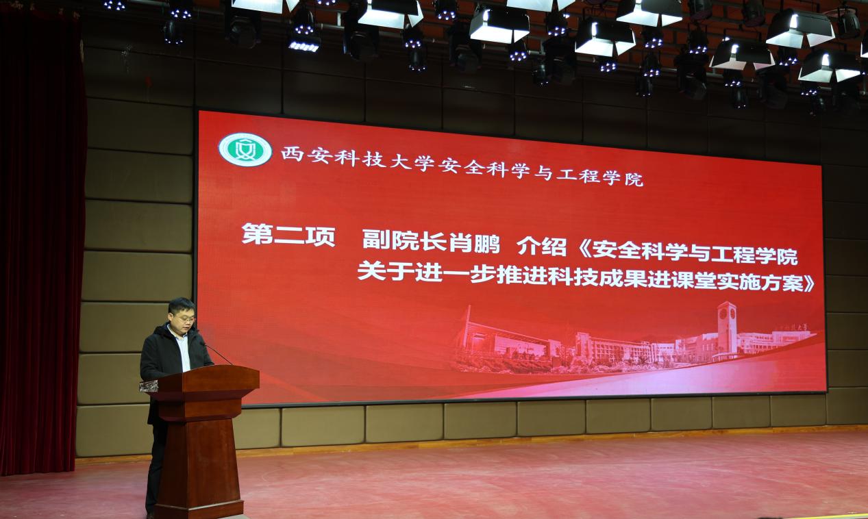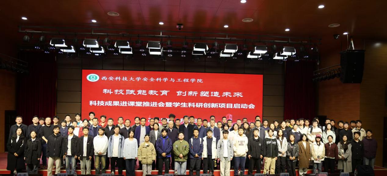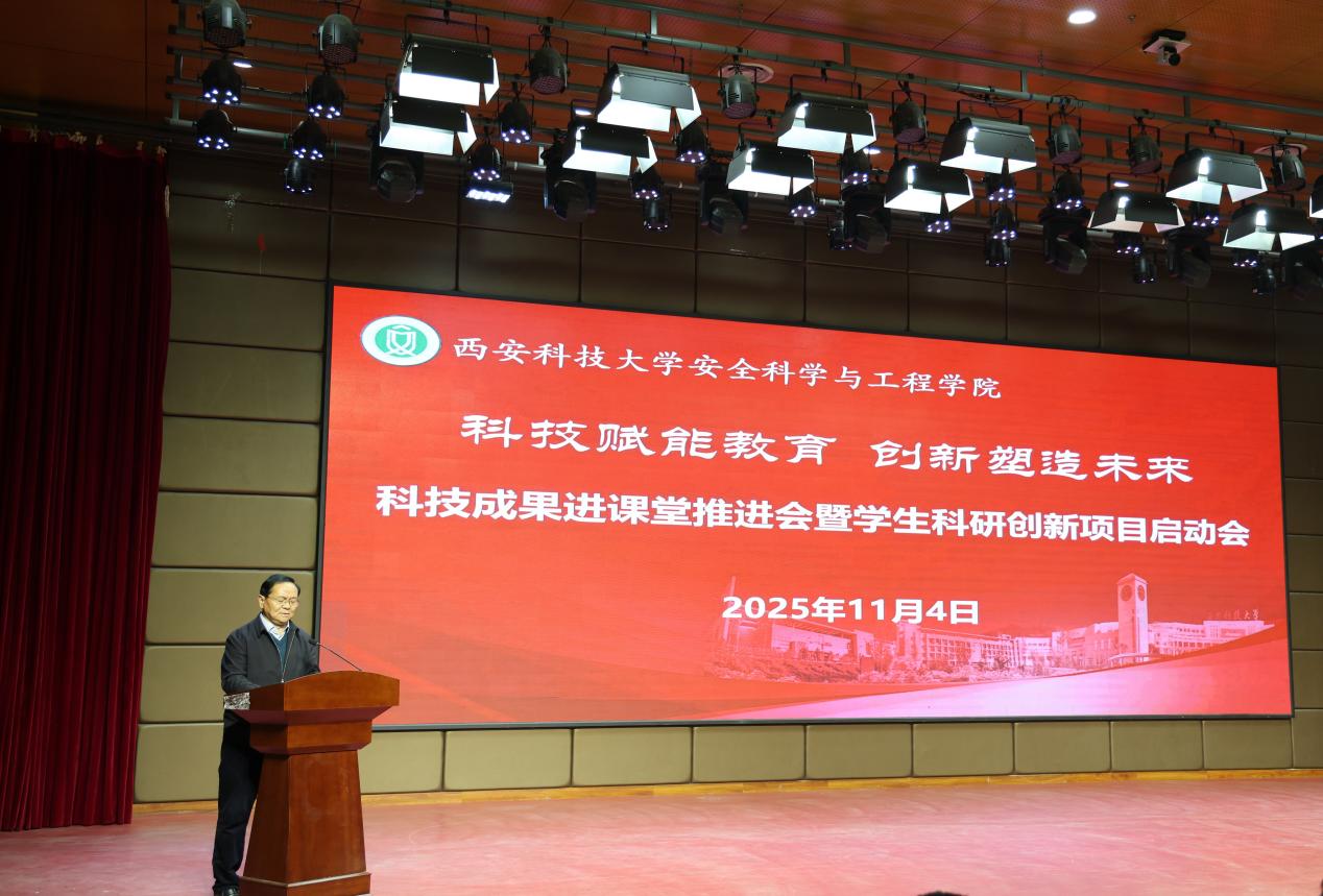 为深入学习贯彻党的二十届四中全会精神,一体推进教育科技人才发展,进一步深化教育教学改革,推动科技成果进课堂,不断培养学生的科技创新意识和能力,真正让课堂“新”起来、让教师“动”起来、让学生“创”起来,11月4日晚,安全科学与工程学院在临潼校区骊山校园煤炭科技楼一楼报告厅举行“科技赋能教育 创新塑造未来”科技成果进课堂推进会暨学生科研创新项目启动会。党委副书记、校长邓军,副校长文虎、罗振敏,教务处副处长王树奇,科技处副处长卢小飞受邀出席活动。学院党委书记刘文刚、执行院长林海飞,党委副书记丁铂,副院长肖鹏、王彩萍、王凯,各系主任、副主任,教师代表、全体辅导员,学生代表参加了活动。活动由刘文刚主持。