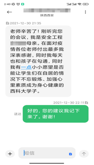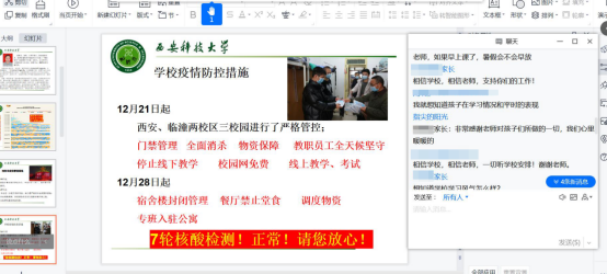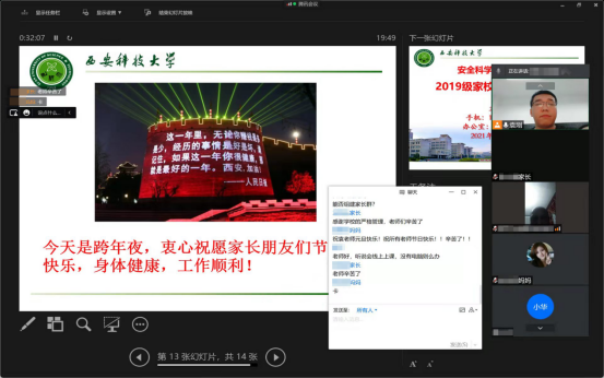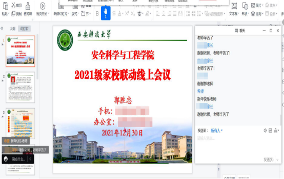 西安突如其来的新冠肺炎疫情,严重影响了师生的工作、学习和生活,牵动着每位家长的心。为了在疫情防控期间更好地对学生的学习、生活进行指导,解除家长担忧,做到家校联动,共同做好疫情防控工作,安全学院积极谋划、主动出击,通过召开疫情防控家校联动线上会议的形式加强家校联动,因势利导做好学生思想政治工作。