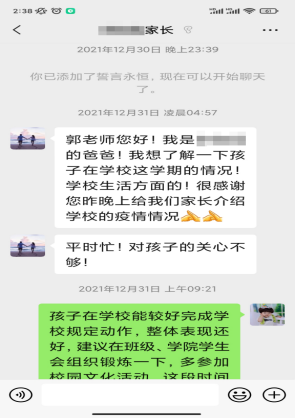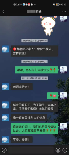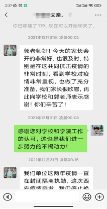 家校联动,共筑防疫屏障。学工干部通过腾讯会议等线上方式先后组织召开“云端”家长会。截止目前,除本科2018级因辅导员王倩老师临时接到紧急任务推迟会议外,本科其他年级实现全覆盖。家长们纷纷表示,疫情防控家校联动线上会议召开的很及时、很必要,对学校、学院的疫情防控举措表示认可和支支持,对学生在疫情期间因宿舍封闭管理导致的一些暂时不便表示理解,愿意鼓励学生参与学校的疫情防控志愿服务工作。部分家长表示愿意捐赠防疫物资支持学院疫情防控工作。