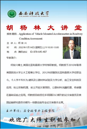 安全科学与工程学院于2022年1月14日,以线上讲座形式举办了“胡杨林大讲堂”,本次报告特邀美国北亚利桑那大学终身职教授何俊兴博士,做了题为“Application of Vehicle Mounted Accelerators in Roadway Condition Assessments”(车载加速器在道路状况评估中的应用)的学术报告(双语报告)
