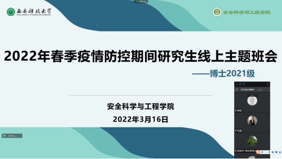 3月16日晚,安全学院召开春季疫情防控期间2021级博士在线主题班会,校党委书记蒋林、安全学院执行院长罗振敏、党委副书记田园、副院长成连华、研究生培养办公室主任姚海燕、辅导员同超和学院2021级全体博士研究生参加了会议。会议由田园主持。
