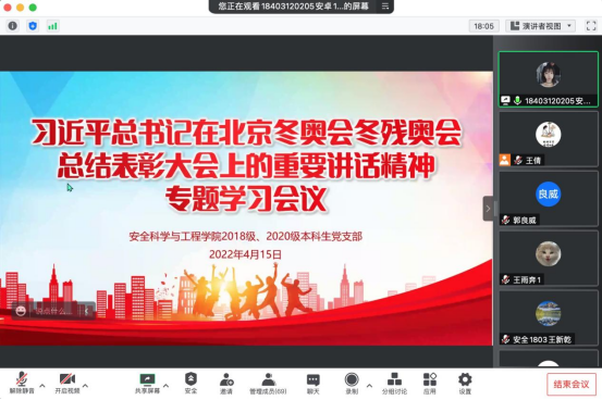 4月15日上午,安全学院2018级、2020级本科生党支部通过腾讯会议召开习近平总书记在北京冬奥会冬残奥会总结表彰大会上重要讲话精神专题学习会。2018级、2020级本科生党支部全体党员参加会议。会议由支部书记王倩主持。