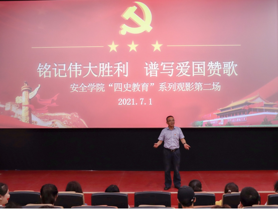安全学院党委书记杜勇在观影结束讲话中希望通过走进影院,观看经典,以喜闻乐见的形式,让更多的师生参与到“四史”学习教育电影课活动中,深刻铭记中国共产党百年奋斗的光辉历程,深刻认识中国共产党为国家和民族做出的伟大贡献,深刻感悟中国共产党始终不渝为人民的初心使命。他要求,安全学院要将学习习近平总书记在庆祝中国共产党成立100周年大会重要讲话做为党史学习教育的一项重要内容,要迅速掀起宣传学习高潮,要以受到表彰的全国优秀共产党员文虎教授为榜样,将爱国主义情怀厚植于心、根植于行,坚定信念、勇担使命,以更加饱满的热情投入工作学习中,为“一流学科”和“一流专业”建设做出贡献。