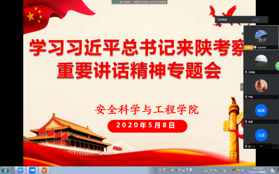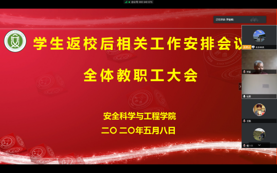 5月8日下午,安全学院通过腾讯网络会议平台召开了新学期第一次全体教职工大会,组织全体教职工学习了习近平总书记来陕考察重要讲话重要指示精神,对学生返校后疫情防控和相关工作进行了安排部署。学院班子成员及全体教职工参加会议,会议由学院党委书记杜勇主持。