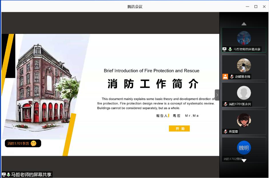 9月14日,消防救援系在线举行消防专业讲座,邀请原上海市消防局高级工程师马哲为学生做题为《消防工作简介》的专题讲座。消防救援系副主任赵婧昱主持讲座,消防工程17级、18级、19级全体学生聆听了报告。