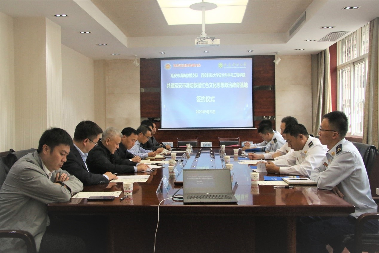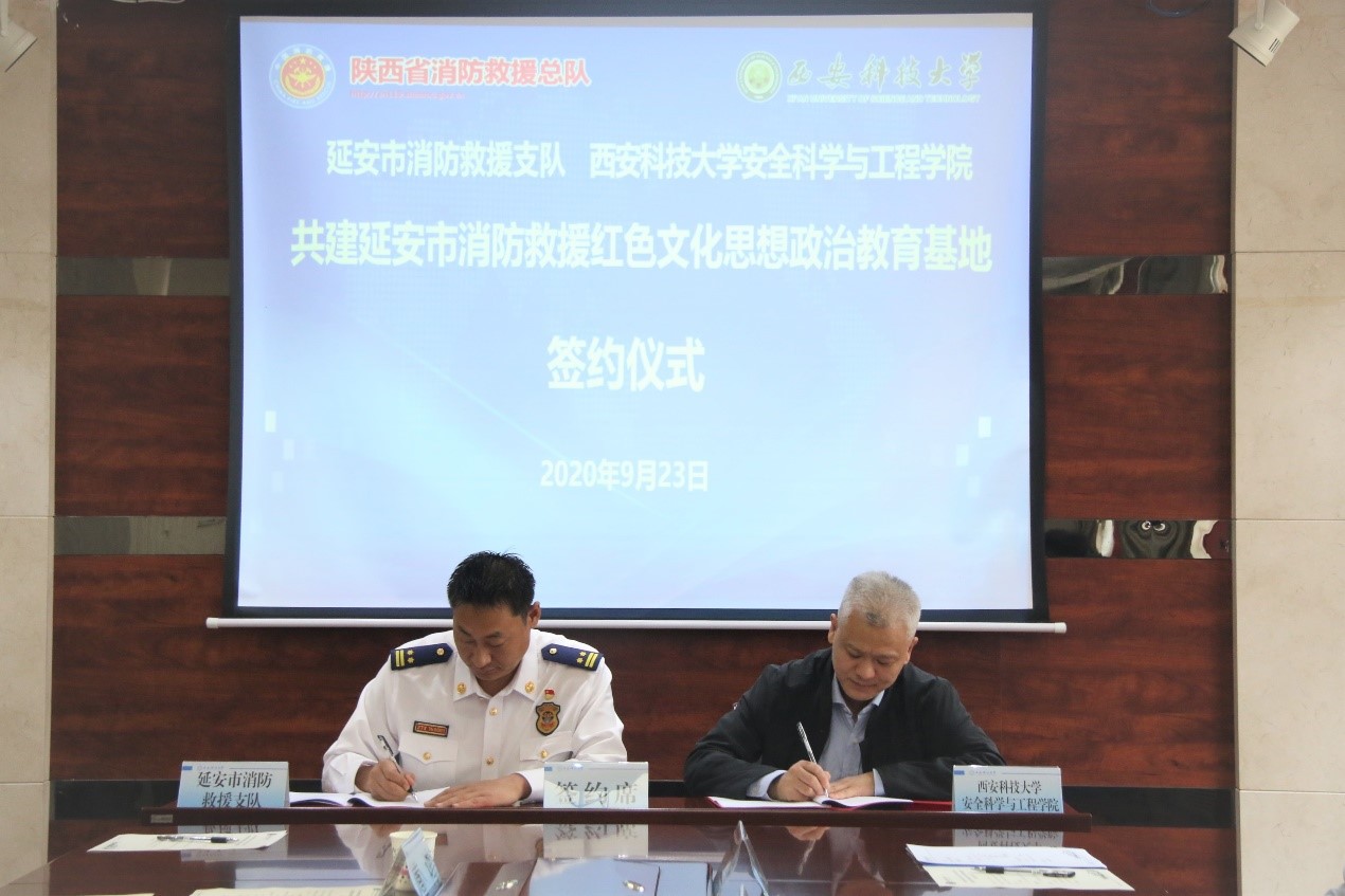 9月23日,延安市消防救援支队与安全科学与工程学院共建“延安市消防救援红色文化思想政治教育基地”签约仪式举行。陕西省消防救援总队政治部主任杨守波、延安市消防救援支队支队长薛辉及相关部门负责人,西安科技大学副校长陈春林、安全科学与工程学院党委书记杜勇、执行院长邓军及消防救援系负责参加了签约仪式,仪式由安全学院党委书记杜勇主持。