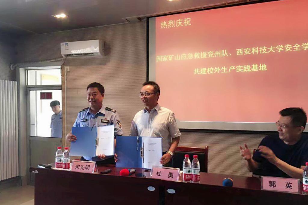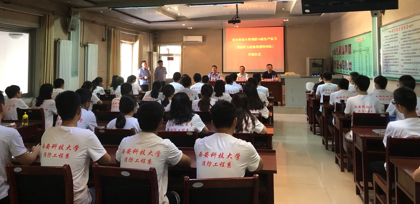 2019年9月7日,西安科技大学与国家矿山应急救援兖州队共建校外生产实习基地揭牌仪式在邹城山东省矿山应急救援中心培训教室举行。兖矿集团安全监察局总工程师郭英、兖矿救护大队总工程师宋先明以及相关负责人;西安科技大学安全科学与工程学院书记杜勇、消防系主任马砺、消防系实习带队教师王伟峰、于志金,以及消防工程2016级全体同学参加了揭牌仪式。