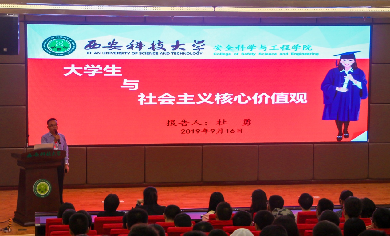 9月4日上午,在雁塔校区教学主楼401阶梯教室,杜勇给2019级全体研究生做了题为“研究生与社会主义核心价值观”的主题报告;9月18日晚上,在临潼校区煤炭科技中心二楼报告厅给2019级全体本科生做了题为“大学生与社会主义核心价值观”的主题报告。他以习近平总书记关于青年工作的重要讲话为引领,根据新入校研究生、本科生的不同特点,从“爱国爱校爱学院、社会主义核心价值体系的建立、诚信是立身之本”等三个方面,要求全体新生牢记按总书记的谆谆教导和殷切期望,将“人生的扣子从一开始就要扣好”。他为同学们介绍了学校和安全学院的发展及基本概况,认为安全学院拥有A类的安全国内为数不多的产学科研平台,也拥有着A类的安全重点学科和一流的专业做为支撑,为同学们日后学习提供了强有力的保障。他强调,全体同学要把爱国爱校爱学院做为一个自觉行动,关心集体、关爱他人,将诚信作为立身之本;要在做好自己的同时,督促他人遵纪守法,弘扬正气,汇聚正能量,弘扬优良传统,凝聚向上力量,不忘初心,牢记青年大学生的使命,将总书记的要求“勤学、修德、明辨、笃实”做为自己的座右铭,以积极主动的姿态面对大学的生活,以新的面貌迎接新的挑战,努力学习科学文化知识,为实现中华民族伟大复兴的中国梦贡献自己的力量。
