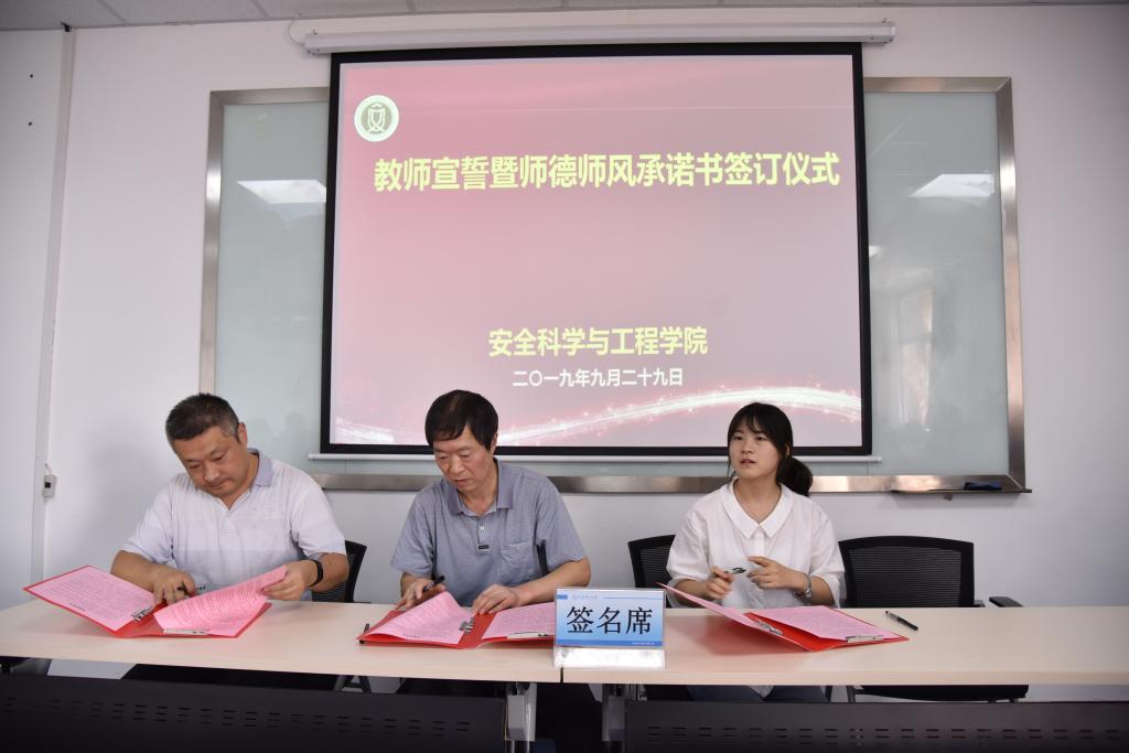 教师宣誓暨师德师风承诺书签名仪式是安全学院开展“不忘初心、牢记使命”主题教育以及“弘扬爱国奋斗精神,建功立业新时代”专题教育的一项重要活动。通过庄严的活动,升华了认识,凝聚了力量,鼓舞了人心,大家纷纷表示将以此活动为新起点,严格要求自己,时刻保持初心和使命,不断提升育人理念,做好“四有好老师”,以最美的姿态迎接祖国70周年华诞,为国家教育事业奋斗终身。