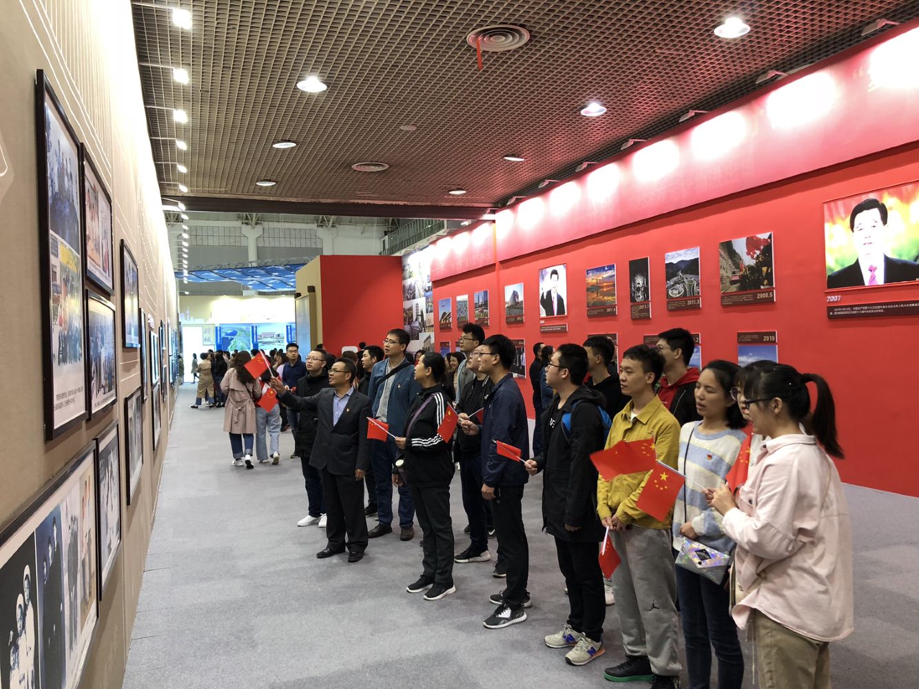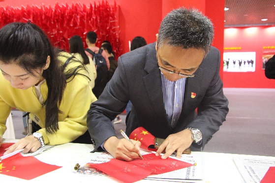 此次展览内容分为“家国情怀”“追赶超越”“不忘初心”三个板块,包括不同历史时期的珍贵图片和实物展品,全方位立体化呈现新中国成立70年来特别是党的十八大以来,全省经济、政治、文化、社会、生态文明和党的建设领域取得的显著成就,以及三秦百姓生活发生的巨大变化。从国家的“大事”,到身边的“小事”,每一个年龄段的人都能找到属于自己的记忆。师生们胸前统一佩戴党员徽章,人人手中挥舞着国旗,大家不时停下脚步仔细观看,认真学习历史资料,还有不少同学,时不时拿出手机把自己感兴趣的图片拍照留存。最后,大家汇聚在“奋斗足迹”展区,在学院党委书记杜勇同志的带领下庄重的举起右拳,重温入党誓词。在“祖国 我想对你说”签名墙下,大家将对祖国最深刻的祝福、以及最真挚的告白写在了红旗上,寄托对祖国最深沉的感情和诚挚的祝福。