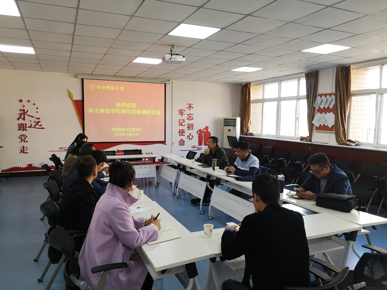 杜勇对尹尚先一行来访调研表示热烈欢迎,就安全学院开展“不忘初心、牢记使命”主题教育情况,学院发展历程、科学研究、学生培养、安全监管监察学院干部培训、专业发展、实验室建设等情况作简要介绍。双方就安全监管监察干部培训、课程建设、科研项目、研究生培养、师资交流等方面展开了热烈的讨论与经验交流。尹尚先对我校安全学科在煤矿安全方面的发展成就表示肯定,并希望能在科学研究、学科建设和研究生联合培养等方面开展实质性合作。