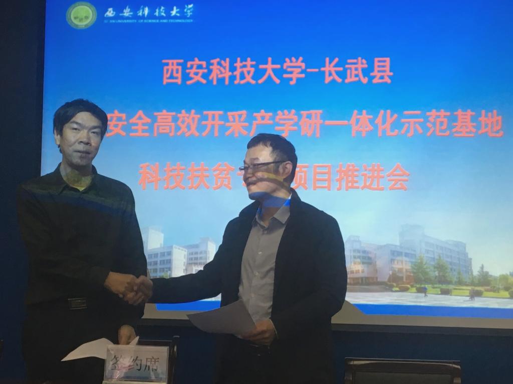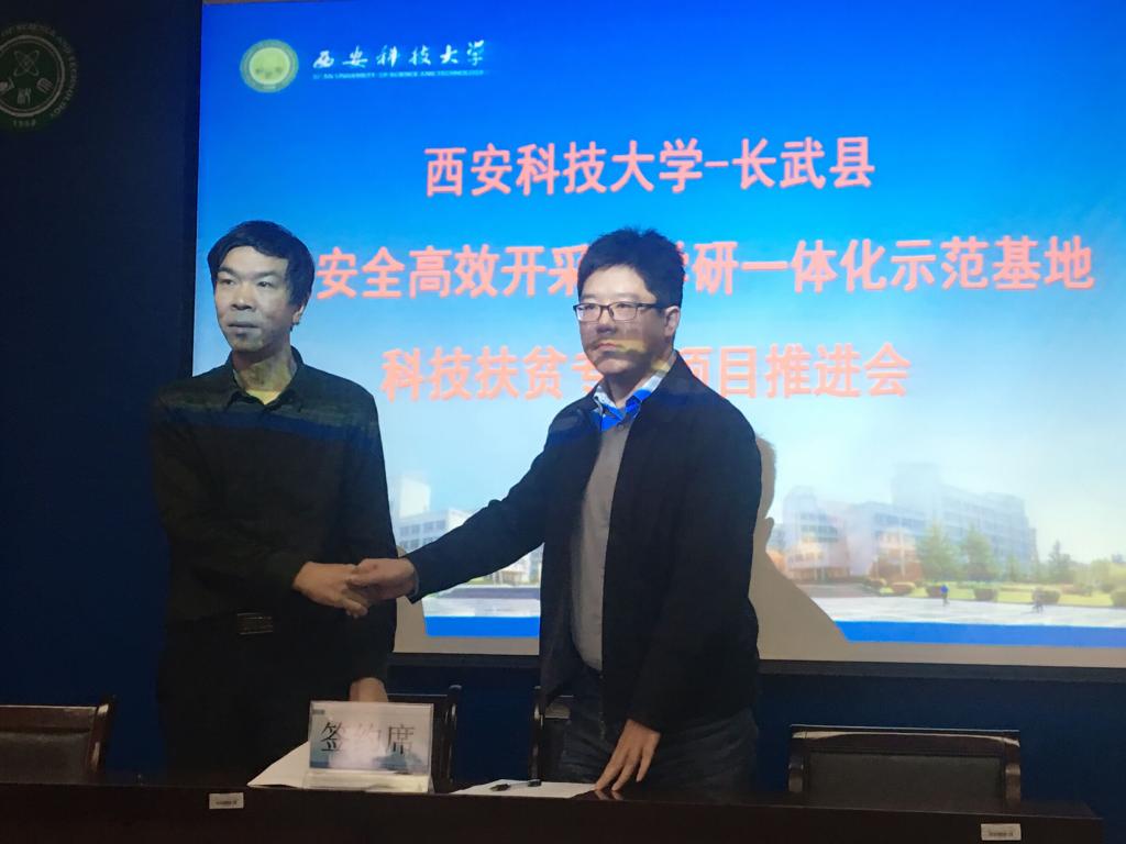 10月15日上午,在学校召开的长武县煤炭安全高效开采产学研一体化示范基地建设推进会上,安全学院教师党支部院金永飞教授和张超教授分别与校科技处处长文虎教授签订了科技扶贫项目协议书。