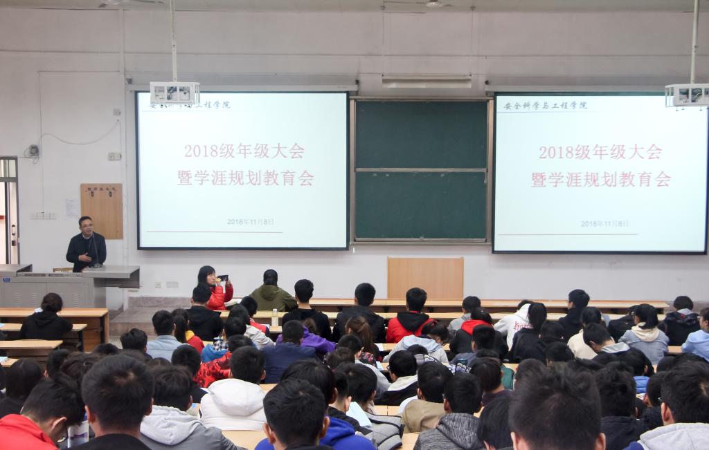 11月8日中午,安全学院在临潼校区骊山校园召开2018级年级大会暨学涯规划教育会,会议由学院党委书记杜勇主讲,副书记田园,带班辅导员及2018级全体学生参加了会议。