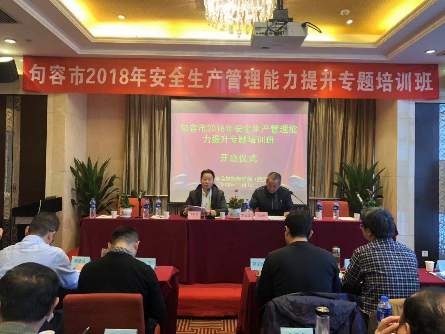 11月12日上午,句容市2018年安全生产管理能力提升专题培训班在西安市芙蓉商务酒店开班。句容市安监局副局长谭恩成、西安科技大学安全技术培训中心副主任张加林及来自句容市安委会各成员单位的62名学员参加了开班式。