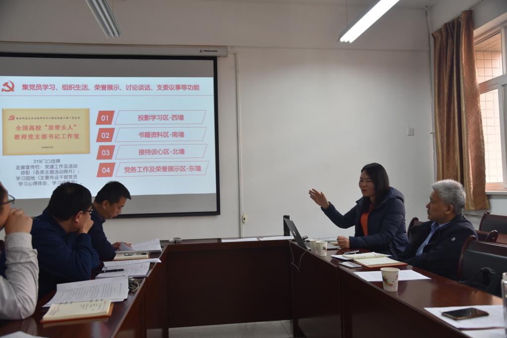 支部书记邓军分享了参加全国“双带头人”教师党支部书记培训班的所获所感,解读了“双带头人”培育工程的目的意义、基本原则、建设要求以及主要内涵。副书记王莉汇报了“双带头人”教师党支部的建设方案,表示将立足“双带头人”支部建立宗旨,积极开展工作室建设,主动申报和承担思政方面的课题研究,总结提炼建设成果,扎实推进系列创新活动,积极推广宣传,引领示范,充分发挥工作室在政治引领、团结凝聚师生、促进学校中心工作等方面的主体作用,力争早日实现“双带头人”工作室3年周期建设目标。宣传委员严敏组织学习并解读了新颁布的《中国共产党支部工作条例(试行)》,纪检委员李磊汇报了参加参加全国“双带头人”教师党支部书记大别山培训班的心得体会。