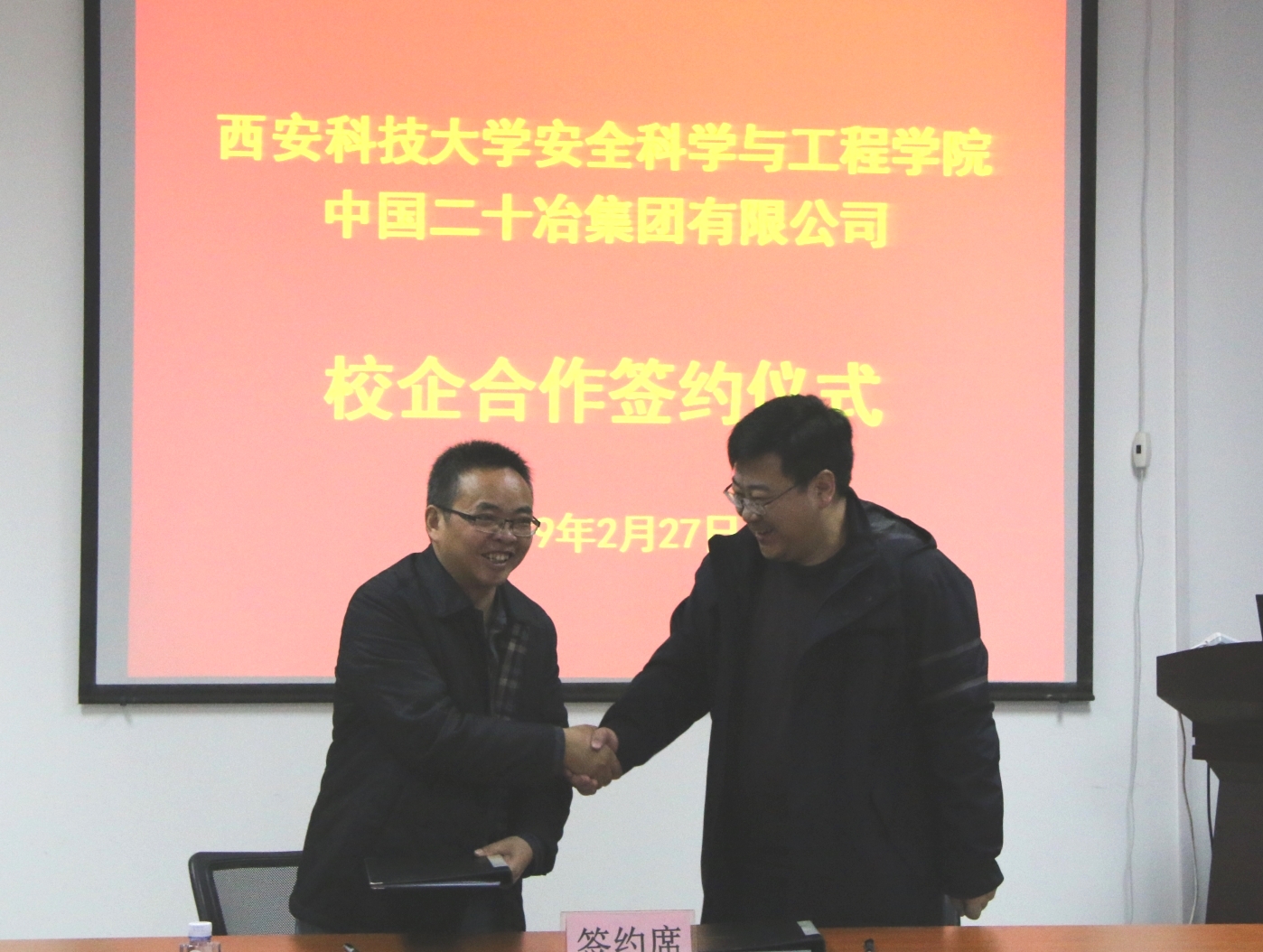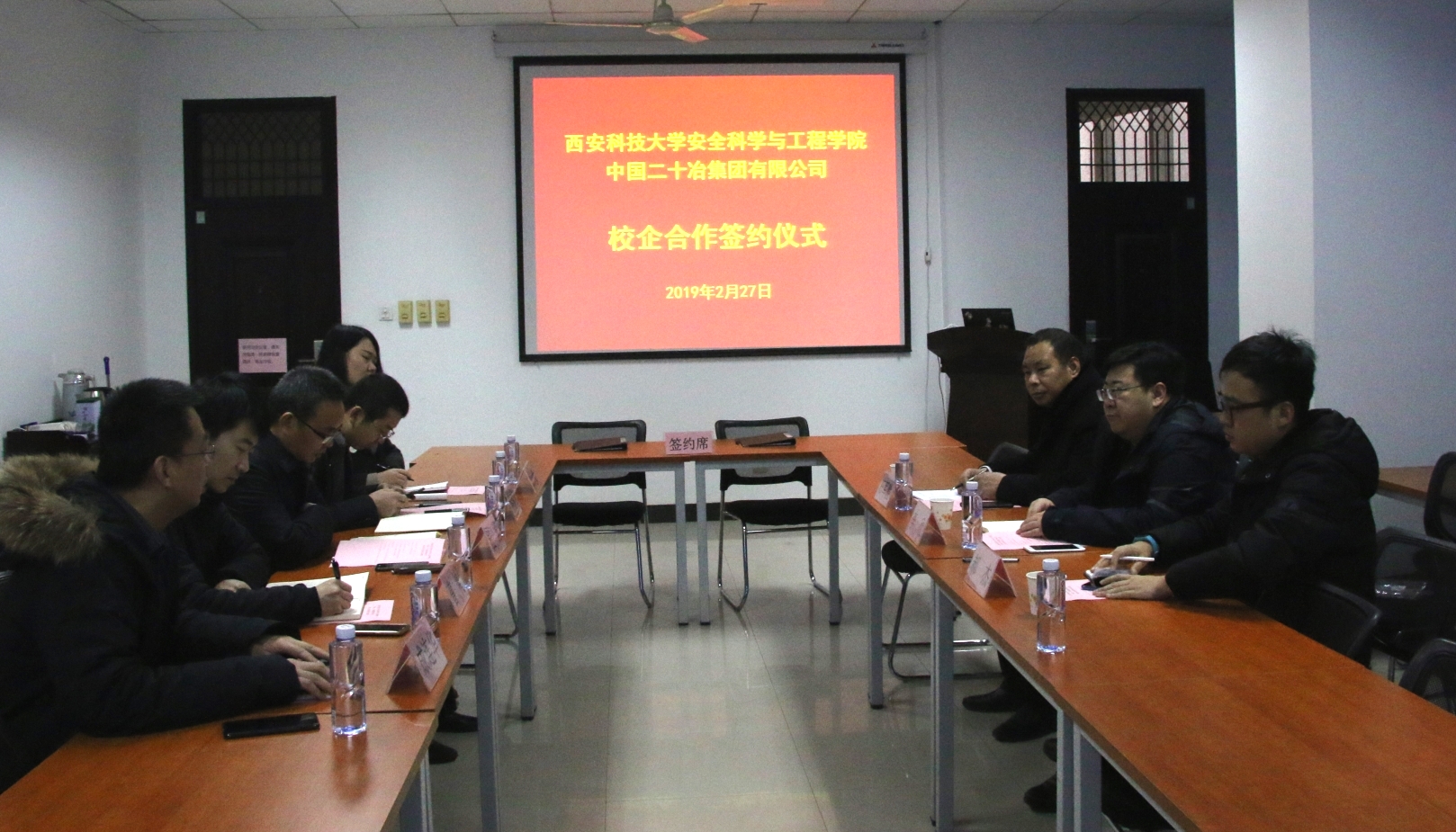2019年2月26日上午,中国二十冶集团有限公司-西安科技大学安全科学与工程学院校企合作座谈会在雁塔校区安全学院会议室进行。中国二十冶集团安全环保部部长李欣、安全环保部检查部部长石军胜、海外公司安全环保部部长郝杰,安全学院党委书记兼常务副院长杜勇、安全学院科研副院长林海飞、行政副院长曹鸿、院长助理兼安全系主任成连华、安全系党支部副书记兼副主任王莉参加座谈会,会议由林海飞主持。