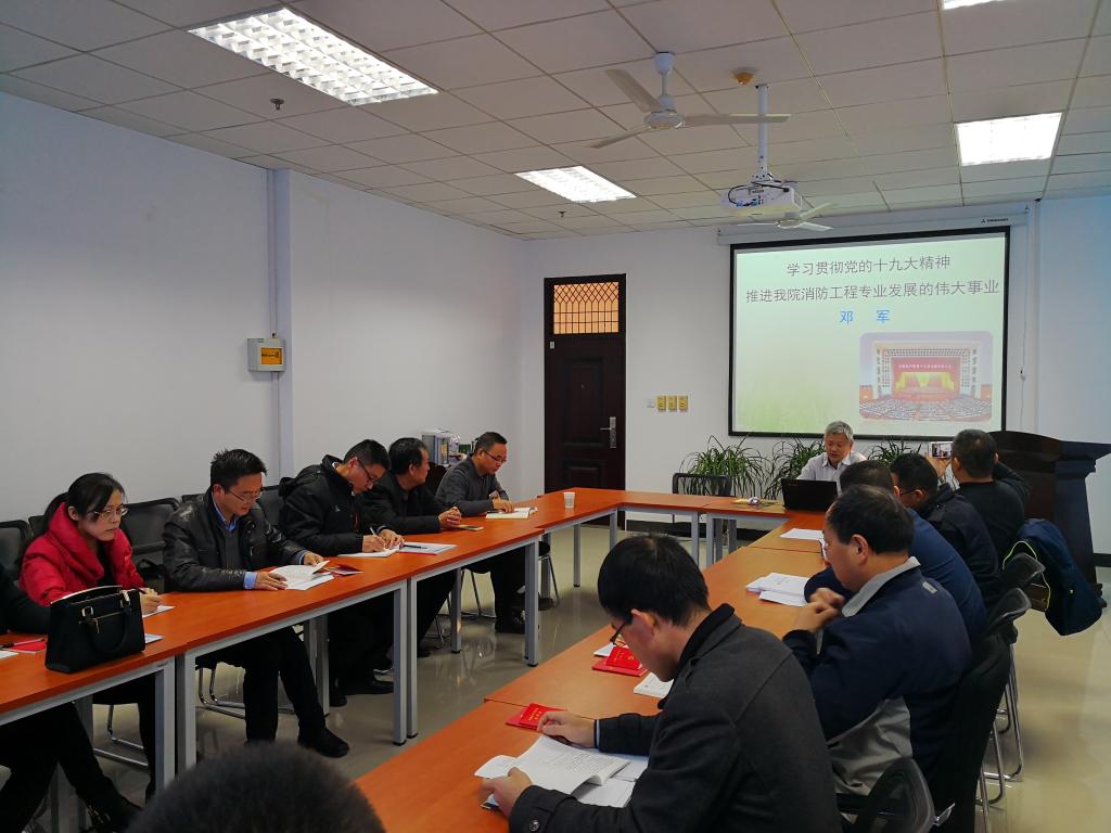 为了进一步学习领会党的十九大精神,推进消防工程专业发展,12月9日上午,安全科学与工程学院党委委员、常务副院长邓军教授为消防工程系党支部讲授了题为“学习贯彻党的十九大精神 推进安全学院消防工程专业发展伟大事业”的十九大精神专题党课。安全学院党委书记杜勇,副院长罗振敏、林海飞,学术委员会陈晓坤教授,安全工程系党支部书记翟小伟,消防工程系党支部全体成员、学生党员代表,安全学院研究生办主任刘黎等师生代表参加了报告会。会议由消防工程系党支部组织委员张京兆同志主持。