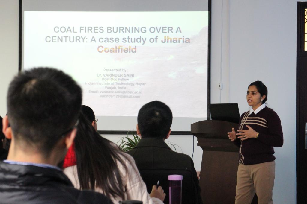 上午,安全学院邀请来自印度的Varinder Saini博士做学术报告,会议在雁塔校区行政楼1508会议室召开。报告题目为:Coal fires burning over a century: A case study of Jharia Coalfield。此次学术报告由安全学院肖旸教授主持,新疆大学曾强教授、天津大学李君副教授、安全学院马砺教授、翟小伟教授、王伟峰老师、易欣老师、赵婧昱老师出席。安全学院博硕士研究生参加会议,听取了报告。Varinder Saini博士大量利用她在实地考察得到的图片、数据、影像,给学生作直观的介绍及深刻的分析,让学生对煤田火灾防治方面的研究技术和方法拓展有了深入的了解。与会师生就报告内容进行了广泛的学术交流。