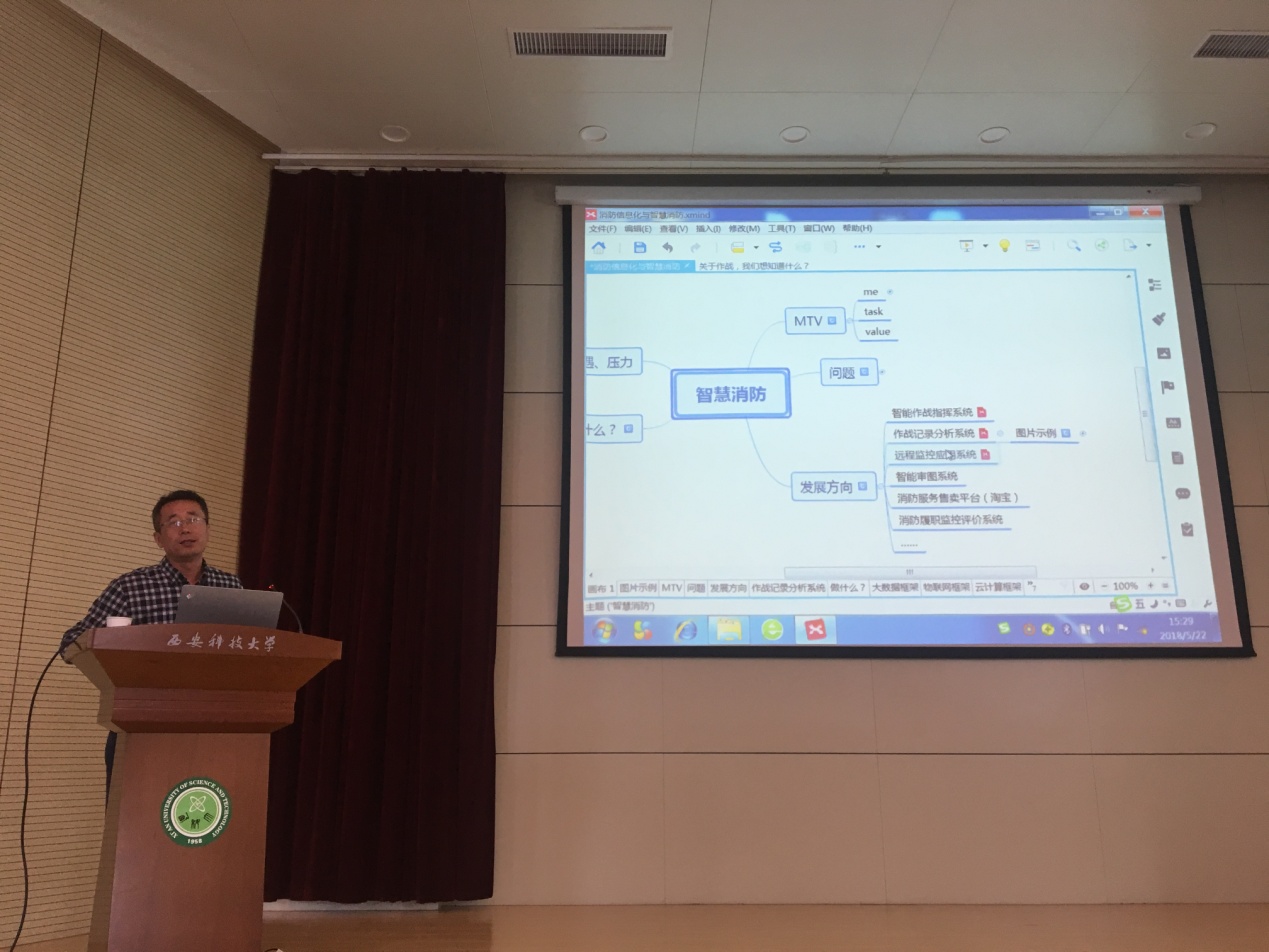 李树刚在致辞中对与会人员的到来表示热烈欢迎,对陕西省消防协会及各成员单位、省内各消防企业长期以来对我校的支持表示感谢,并简要介绍了我校及安全学科的发展概况,希望今后加大我校与陕西省消防协会及相关企业的合作,进一步促进政、产、学、研、用的融合,共同为陕西省消防安全奉献更多的智慧和更大的力量。贾西海代表陕西省消防协会对我校承办此次会议表示感谢,就举办这次活动的目的以及意义进行了阐述,对陕西省消防行业的发展状况进行了分析,希望通过消防新技术交流会的召开提升我省智慧消防发展水平。会议邀请著名消防专家许传升做了题为“消防信息化与智慧消防”的主题报告,以他丰富的从业经验对“智慧消防”“消防新技术”等领域做出了详细的介绍,并对在场的企业提出了一些学术性、研究方向性的问题,为企业将来的市场前景提供了理论参考。