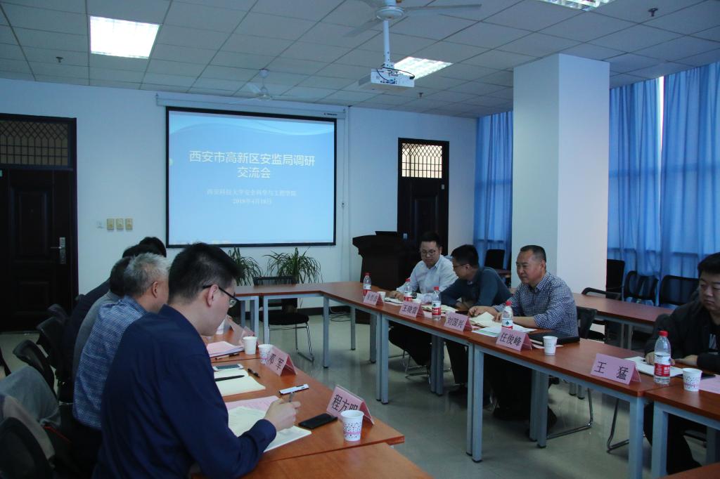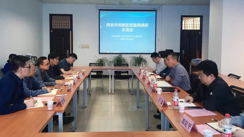 4月18日下午,西安市高新区高监局局长刘国兴、副局长任俊峰一行6人来我校安全学院调研。调研座谈会在雁塔校区安全学院会议室召开。安全学院党委书记杜勇、常务副院长邓军、副院长文虎和相关人员出席调研座谈会。