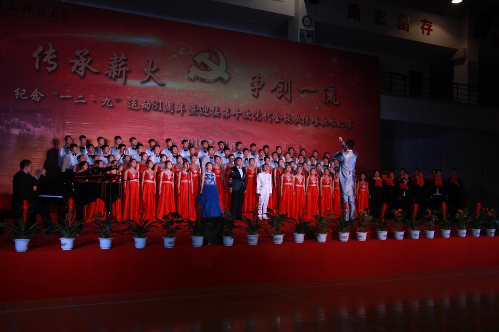 12月8日晚,西安科技大学纪念“一二•九”运动81周年暨迎接第十次党代会校歌传唱歌咏比赛在临潼校区体育馆隆重举行,安全学院党委书记杜勇,副院长罗振敏、林海飞、曹鸿,教师代表、全体辅导员与学生代表90余人组队代表学院参赛,最终凭借《祖国颂》、《西安科技大学校歌》两首歌曲的精彩演绎获得比赛第二名。