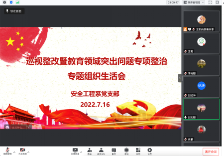 7月16日上午,安全学院安全工程系党支部召开巡视整改暨教育领域突出问题专项整治专题组织生活会。校党委书记蒋林全程参加并指导,安全学院党委书记刘文刚点评,安全工程系党支部全体党员参加会议。会议由安全工程系党支部副书记王凯主持。
