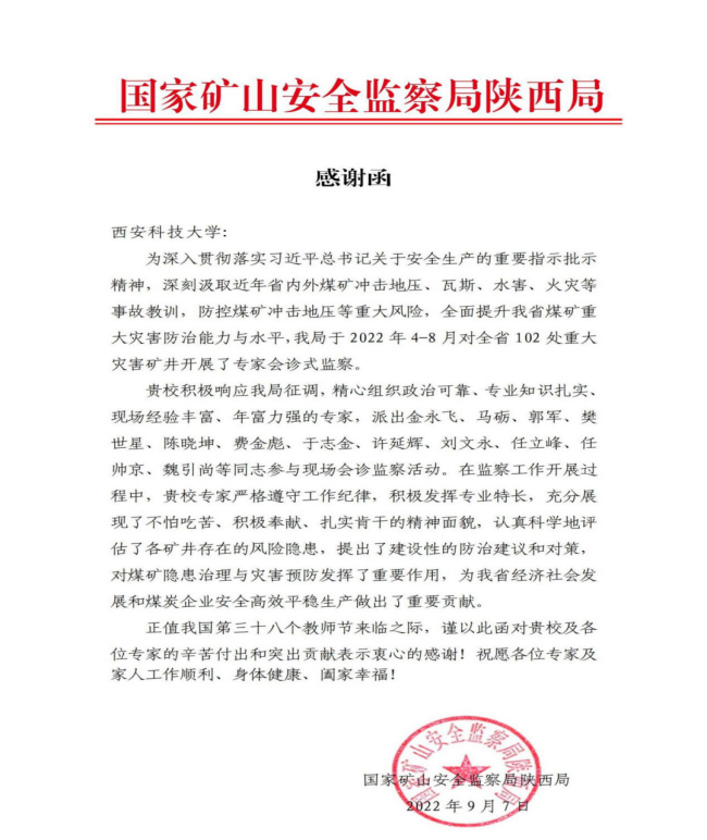 近日,学校收到国家矿山安全监察局陕西局感谢信,对安全学院金永飞等12名教师在全省重大灾害矿井专家会诊式监察中的工作给予了充分肯定。信中说,贵校积极响应我局征调,选派的专家严格遵守工作纪律,积极发挥专业特长,充分展现了不怕吃苦、积极奉献、扎实肯干的精神风貌,为我省经济社会发展和煤炭企业安全高效平稳生产做出了重要贡献。