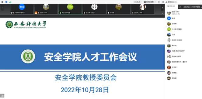 为了深入学习贯彻党的二十大精神,贯彻落实“科技是第一生产力、人才是第一资源、创新是第一动力”要求,深入实施科教兴国战略、人才强国战略、创新驱动发展战略,促进人才工作高质量发展,安全学院于10月28日在线召开人才工作研讨会。会议由学院执行院长罗振敏主持。副校长、安全科学与工程学科带头人邓军,学院教授委员会全体委员参加了会议。