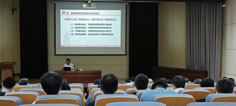 刘文刚领学了习近平总书记关于教师队伍建设的重要讲话精神,解读了《新时代教师职业行为十项准则》、《教育部关于高校教师师德失范行为处理的指导意见》、《高校预防与处理学术不端行为办法》等规章制度,开展了教育部、省教育厅公布的违反教师职业行为十项准则典型案例和科技部、国家自然科学基金委员会查处的学术不端案件的警示教育,并从“提高政治站位、增加思想自觉和行动自觉,强化理论武装、提高思想境界和师德水平,严格要求自己、规范自己的从教从政行为,坚持底线思维、营造良好的育人环境和政治生态”等四个方面提出了加强师德师风建设的路径和措施。