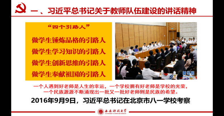 本次专题报告会,既是一次师德集中学习教育,更是一次对标对表的激励鞭策,旨在教育引导学院教职员工坚持以习近平新时代中国特色社会主义思想为指导,时刻不忘立德树人根本任务,牢记为党育人、为国育才的教育使命,不断增强规矩意识和纪律意识,坚持“四个相统一”,争做“四有”好老师,做学生的“四个”引路人,努力建设一支师德高尚、业务精湛、结构合理、充满活力的高素质专业化教师队伍,为奋力谱写学院事业高质量发展新篇章提供有力支撑。