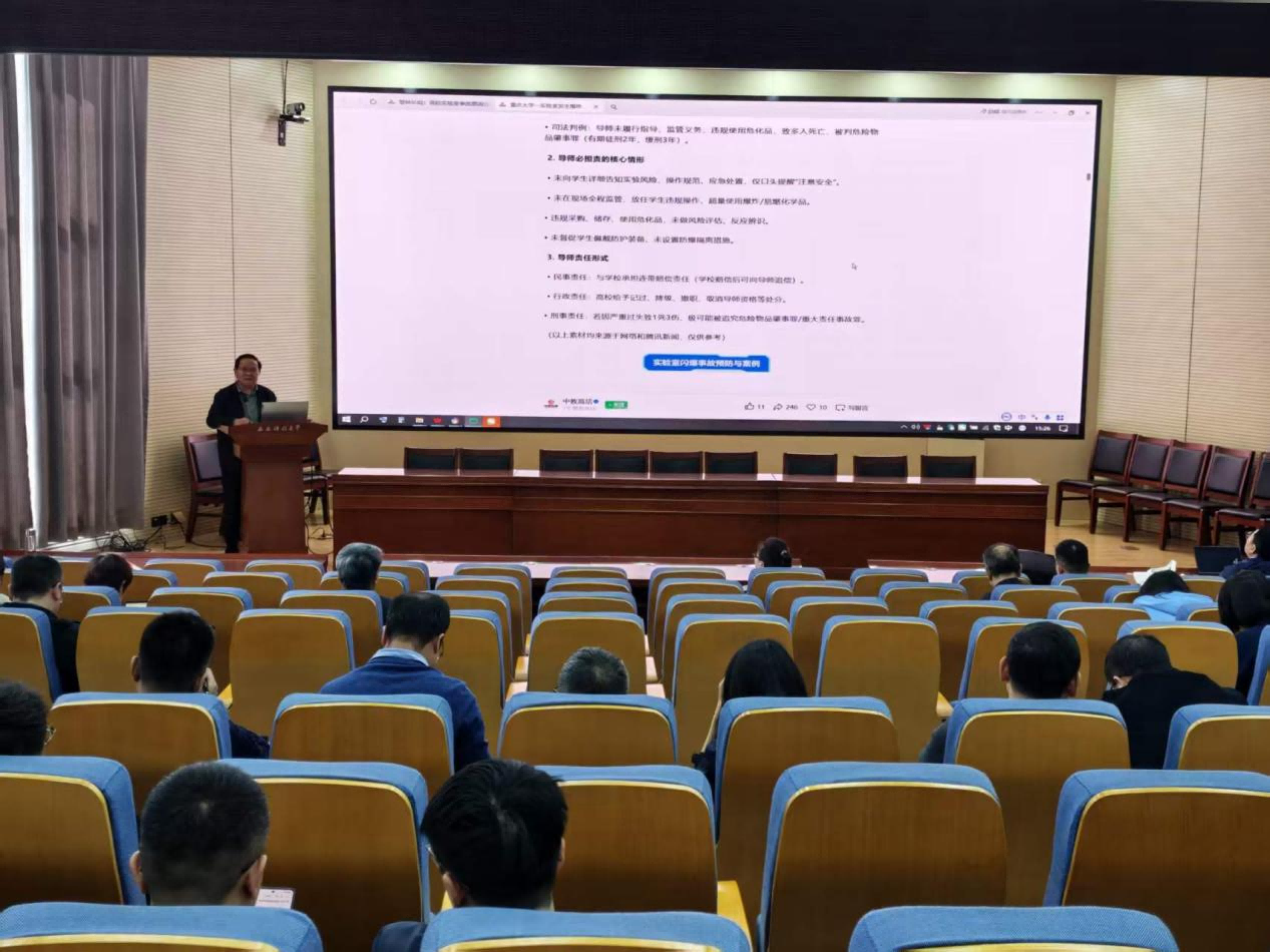 学院分管科研的副院长肖鹏传达了3月27日上午学校实验技术人员队伍建设调研座谈会精神,并围绕实验室安全管理工作进行了专题辅导。他通报了近年来全国高校实验室安全事故案例,从人员安全意识薄弱、安全管理体制不健全、安全教育与培训不到位等方面,分析了当前高校实验室安全事故频发的主要原因,强调要明确实验室自身风险特性、实验材料物化特性、操作人员行为风险,核心在于落实安全责任、完善规章制度、强化安全培训教育,并就常态化做好学院实验室隐患排查及整改工作提出了明确要求。一要压实主体责任,时刻绷紧安全之弦;二要强化安全教育培训,筑牢安全知识根基;三要严管危险化学品,抓实采购、储存、使用、处置全流程闭环管理;四要紧盯安全风险,严守存量安全底线;五要排查应急装备状态,确保各类应急设施随时可用;六要切实履行研究生导师监管指导职责,规范学生实验操作行为。