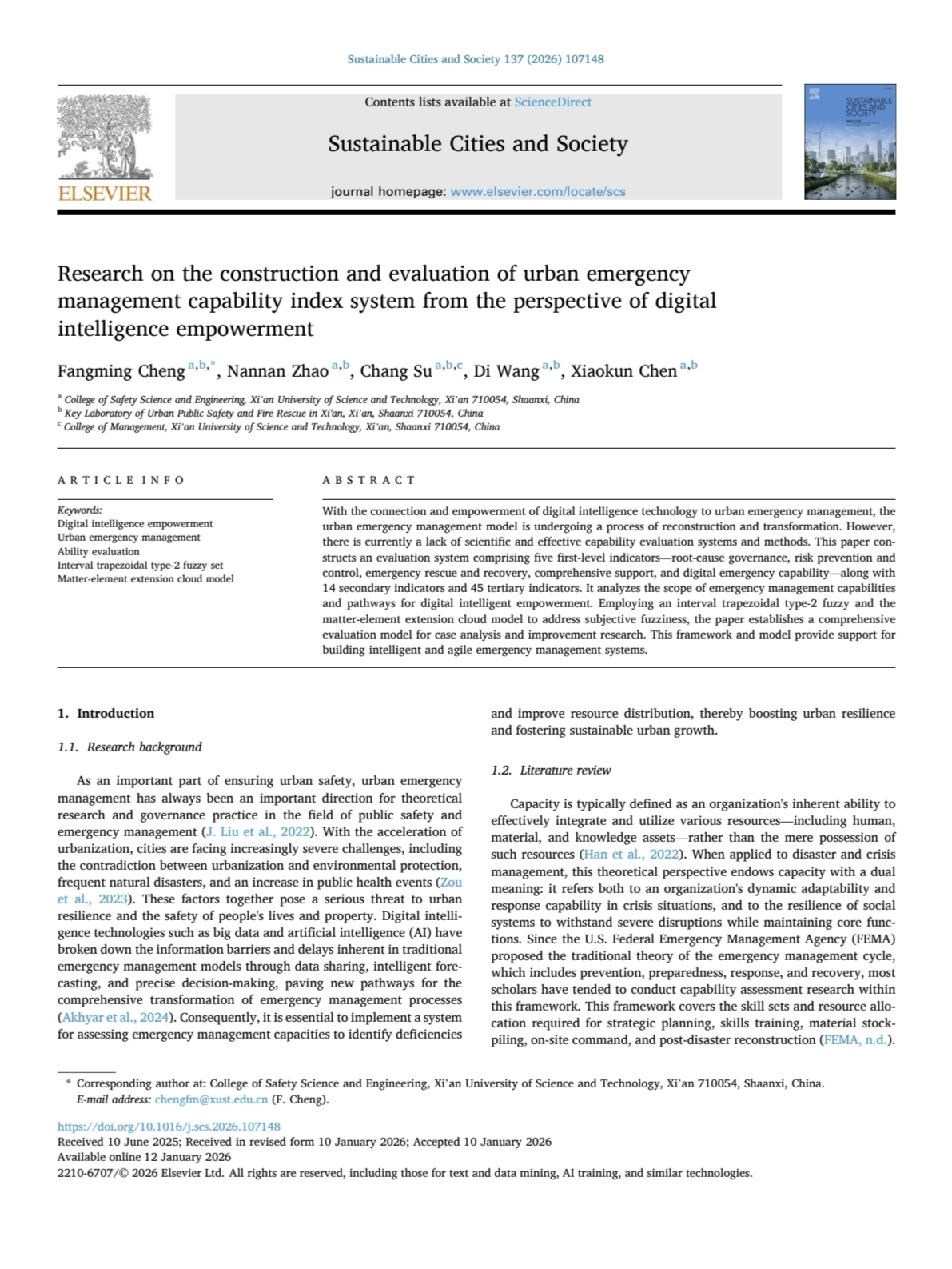 安全科学与工程学院程方明教授课题组在国际权威期刊《Sustainable Cities and Society》发表研究成果